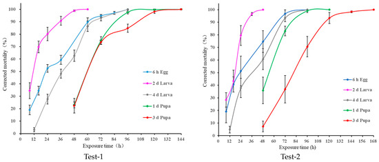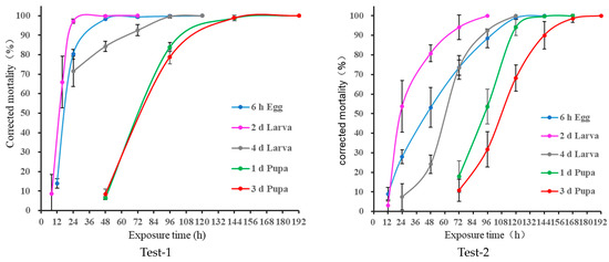 The exposure time–mortality (mean ± SD, adjusted with Abbott’s formula) of immature stages of Drosophila suzukii treated under 0 °C cold-treatment conditions. Left: Test-1; Right: Test-2.