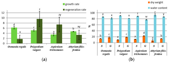 In vitro culture growth parameter in four pteridophyte species: (a) growth rate of gametophytes and regeneration rate of sporophytes; (b) percentage of dry weight and water content of sporophytes (S) and gametophytes (G). The columns marked with different letters are significantly different (p < 0.05).