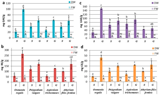 Concentrations of compound classes: (a) PC, (b) FC, (c) TT, and (d) TC in sporophyte (S) and gametophyte (G) in vitro cultures in four pteridophyte species. The columns marked with different letters are significantly different (p < 0.05) in DW series (a–e) and FW series (w–z).