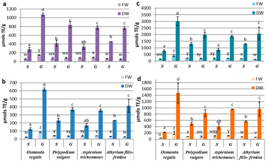Antioxidant activity of sporophyte (S) and gametophyte (G) produced by in vitro cultures at four pteridophyte species expressed as mM TE (µmols TE/g DW-FW) using (a) DPPH, (b) TEAC, (c) CUPRAC, or (d) FRAP method. The columns marked with different letters are significantly different (p < 0.05) in DW series (a–d) and FW series (u–z).