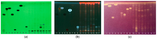 - Jesionek, W.; Majer-Dziedzic, B.; Choma, I.M. Separation, Identification, and Investigation of Antioxidant Ability of Plant Extract Components Using TLC, LC-MS, and TLC-DPPH. J. Liq. Chromatogr. Relat. Technol. 2015, 38, 1147–1153. [Google Scholar] [CrossRef]