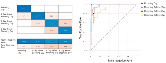 The reliability of the quadratic SVM with the highest accuracy was verified by measuring the area under the curve (ACU) of the receiver operating characteristic, and by curve plotting the proportion of correct predictions (true positive rate: TPR) and the proportion of incorrect predictions (false positive rate: FPR) for each predicted blooming day. The ACU on the blooming day was the highest at 0.99 and the lowest at 0.88 at 4 days before the blooming day, but both were above 0.8, which was considered the standard for ACU accuracy. Therefore, among the six kernel functions, an SVM with a quadratic kernel function is the best for spectral classification by the predicted blooming day (Table 3, Figure 4).