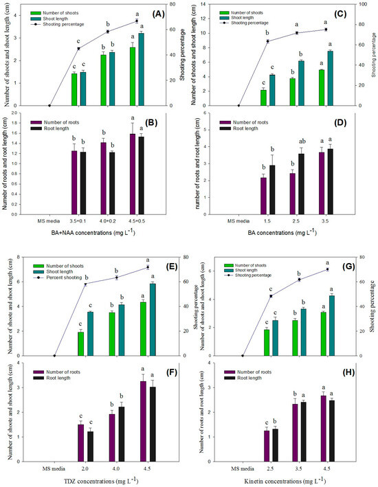 The second-highest number of shoots per explant (4.92 ± 0.08), shoot length (7.52 ± 0.14), and shooting percentage (76.67% ± 1.60) was achieved with a medium containing BA (2.5 mg L−1) (Figure 7C,D and Figure 8B,G). TDZ treatment resulted in an average of 4.50 ± 0.14 shoots per explant, with a shoot length of 5.90 ± 0.11 cm and a shooting percentage of 73.33 ± 1.66%. (Figure 7E,F and Figure 8C,H). Similarly, KIN treatment also yielded 3.70 ± 0.08 shoots per explant, with a shoot length of 3.40 ± 0.07 cm and a shooting percentage of 70.00% ± 0.00 (Figure 7G,H and Figure 8D,I).