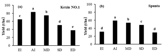 Tuber yield at the harvest for potato cultivars (a) Kexin No. 1 and (b) Spunta under five irrigation treatments. In (a,b), EI: excessive irrigation treatment, AI: adequate irrigation treatment, MD: moderate dehydration treatment, SD: severe dehydration treatment, ED: extreme dehydration treatment. The tubers with a diameter >0.5 cm were included. The sampling dates are 15 September and 10 September, respectively. Different letters denote statistically significant differences at p < 0.05.