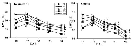 The leaf water content of two potato varieties at 18, 37, 52, 73, and 90 days after emergence (DAE) under five irrigation treatments. For the Kexin No.1 (left) and Spunta (right), EI: excessive irrigation treatment, AI: adequate irrigation treatment, MD: moderate dehydration treatment, SD: severe dehydration treatment, ED: extreme dehydration treatment. (Different lowercase letters in the same column indicate significant differences at the 0.05 level).