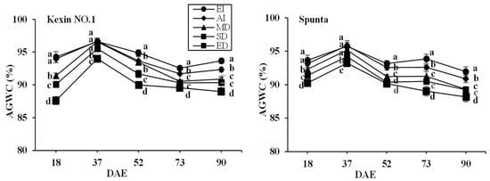 Similar results were observed in aboveground water content (AGWC) of potato plants (Figure 4). Throughout the growth stages, the AGWC was proportional to the soil water content. The AGWC in EI treatment was the highest, followed by AI treatment, although there was no significant difference at 18 and 37 DAE. The AGWC in MD treatment was significantly greater than that in SD treatment, except for 73 and 90 DAE. The AGWC in ED treatment was the lowest in both cultivars.