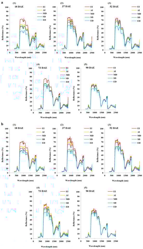 Changes in the hyperspectral reflectance under five irrigation treatments for (a) Kexin No. 1 and (b) Spunta: (1) High spectral reflectance at 337–2521 nm 18 days after emergence (DAE); (2) High spectral reflectance at 337–2521 nm 37 DAE; (3) High spectral reflectance at 337–2521 nm 52 DAE; (4) High spectral reflectance at 337–2521 nm 73 DAE; (5) High spectral reflectance at 337–2521 nm 90 DAE. In (a,b), EI: excessive irrigation treatment, AI: adequate irrigation treatment, MD: moderate dehydration treatment, SD: severe dehydration treatment, ED: extreme dehydration treatment.