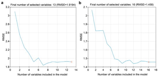 The final number of sensitive bands selected when the RMSE value tends to be stable (the curves represent the RMSE value when different numbers of bands were selected): (a) LWC, and (b) AGWC. The red squares represented the final number of selected variables 13 (a) and 16 (b) respectively.