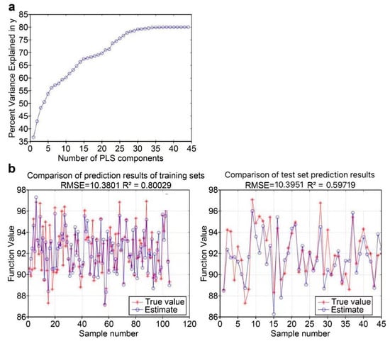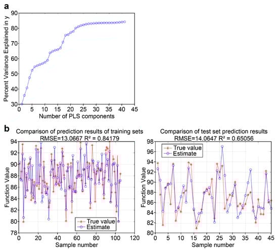 When we extracted the 44 components, the ratio of the explained dependent variables was 80.03% (Figure 8a). R2 = 0.8003, RMSE = 10.3801, and the test set prediction results R2 = 0.5972 of the above PLSR model (Figure 8b).