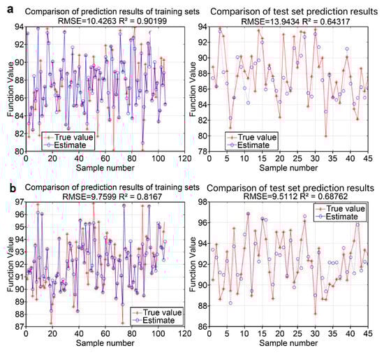 The results of the SVM-based LWC prediction model are as follows: The training set was trained, and the training results are shown in Figure 9a. The training set R2 is 0.9020, and the test set R2 is 0.6432. The results of the SVM-based AGWC prediction model are as follows: The training set was trained, and the training results are shown in Figure 9b; the training set R2 is 0.8167 and the test set R2 is 0.6876.