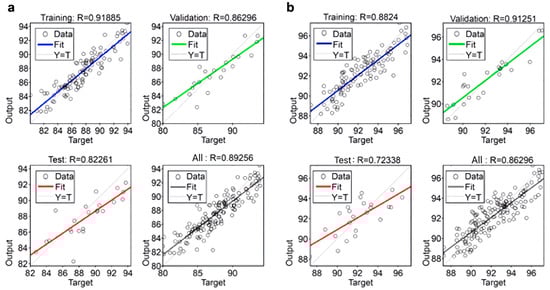 A range of 8–16 hidden nodes were selected for the experiment. Table 5 shows that LWC and AGWC have the best model fit, with 12 hidden nodes. For this hidden node, the model fit R2 of the BP neural network regression model between the spectrum and LWC is 0.8926, while that of R2 between the spectrum and AGWC is 0.8671 (Figure 10a,b).