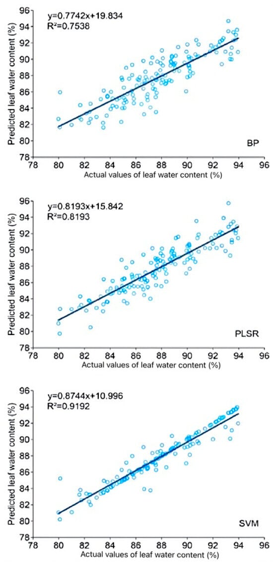 In summary, through comparative analysis, PLSR, SVM, and BP models have a higher model fit on LWC than on AGWC, with R2 values reaching 0.8418, 0.9019, and 0.8926, respectively. This indicates that the potato LWC monitoring model based on hyperspectral data has high accuracy for prediction. When using three models to predict potato LWC, the R2 values were as high as 0.8193, 0.9192, and 0.7538 (Figure 11). This further indicates that using SVM based on hyperspectral data to estimate potato LWC is the best choice.