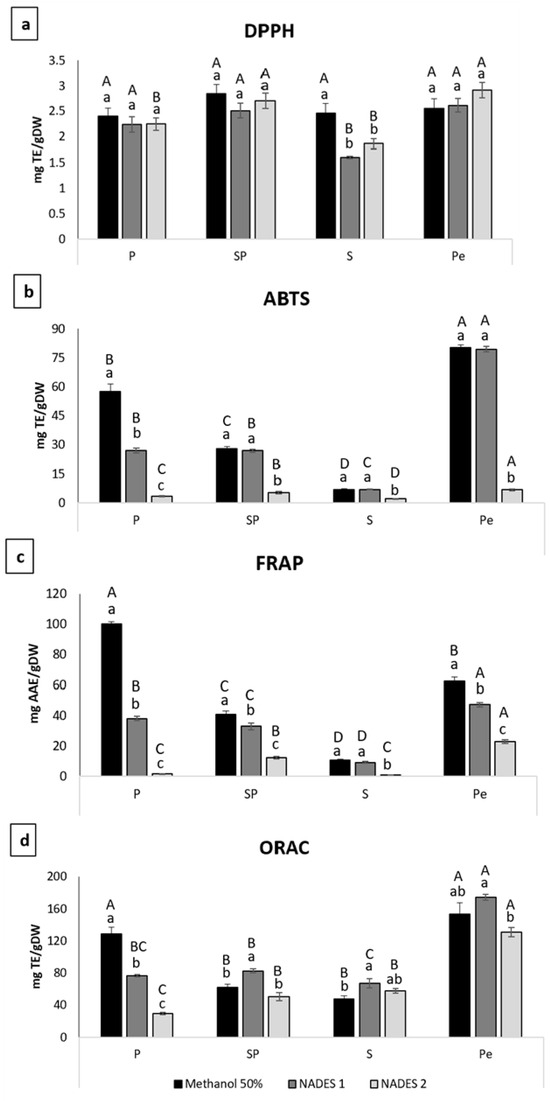 Antioxidant capacity, determined by 2,2-diphenyl-1-picrylhydrazyl (DPPH), 2,2′-azino-bis(3-ethylbenzothiazoline-6-sulfonic acid) (ABTS), ferric reducing antioxidant power (FRAP), and oxygen radical absorbance capacity (ORAC) assays, of extracts from different fruit parts (P, pulp; SP, seed-containing pulp; S, seeds; and Pe, peel) of O. leucotricha obtained with different extraction solvents (methanol 50%; NADES 1, glycerol:urea, 1:1; NADES 2, citric acid:sorbitol, 1:2). Values are expressed as mean ± SE. Different letters in each series indicate significant differences (p < 0.05) (Duncan’s new multiple range test). Uppercase letters indicate significant differences (p < 0.05) between the four parts of the fruits, while a lowercase letter denotes significant differences (p < 0.05) between solvents.