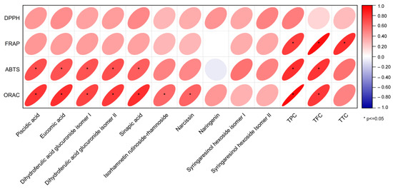 Heatmap corresponding to Pearson’s correlation coefficients between the most relevant phenolic compounds identified by HPLC-HRMS, total phenolic compounds, total flavonoids, total tannins, and antioxidant capacities (DPPH, FRAP, ABTS, and ORAC) from the pulp, seed-containing pulp, seeds, and peel extracts from O. leucotricha. * Correlation is significant (p ≤ 0.05). A more elliptical shape indicates a greater correlation.