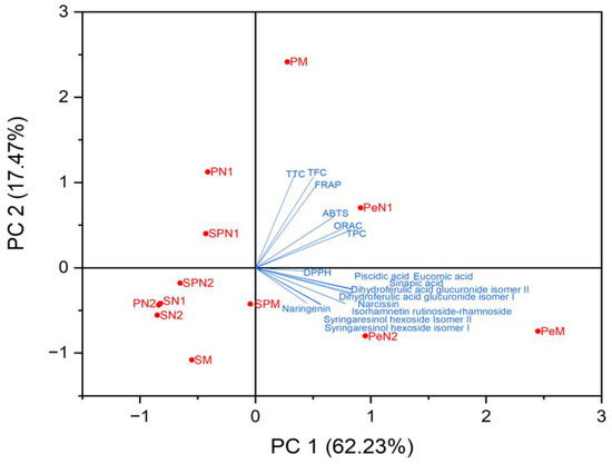 Biplot principal component analysis (PCA) of extracts from O. leucotricha fruit parts using NADES and a conventional solvent (methanol 50%). PM: methanolic extract of the pulp, PN1: NADES 1 extract of the pulp, PN2: NADES 2 extract of the pulp, SPM: methanolic extract of the seed-containing pulp, SPN1: NADES 1 extract of the seed-containing pulp, SPN2: NADES 2 extract of the seed-containing pulp, SM: methanolic extract of the seeds, SN1: NADES 1 extract of the seeds, SN2: NADES 2 extract of the seeds, PeM: methanolic extract of the peel, PeN1: NADES 1 extract of the peel, PeN2: NADES 2 extract of the peel.