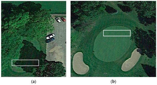 Shade (a) and sun (b) putting greens used in this study. The percent shade covered was determined by quantifying the area shaded in this image vs. the area that was not shaded (Google Earth). The shaded green was 98.8% shaded by trees (bottom right: Colorado Blue Spruce; upper left: Japanese Lilac, and 2 American Elms) surrounding the green and the sun green was in 100% sun.