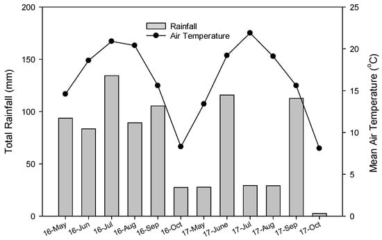 Total rainfall (mm) and mean air temperatures (°C) during the growing season (May–October) of 2016–2017. Total rainfall is indicated by a bar chart (left axis) and mean air temperature is indicated by a line graph (right axis). Weather data were collected by the Grand Forks International Airport (Grand Forks, ND, USA).