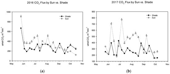 In both years of the study, soil CO2 flux from the sunny plots was significantly (p < 0.001) higher than the soil CO2 from the shaded plots (Figure 3, Table 2). The sunny plots also show this same difference on 10 of the 12 significant sampling dates in 2016 (Figure 3a) and 12 of the 13 significant sampling dates in 2017 (Figure 3b). Several studies have observed decreases in soil respiration associated with decreases in soil temperature [21,54] with shading by tree canopies decreasing soil respiration by 34% due to the decrease in soil temperature [21].