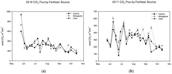 Fertilizer source (control, Milorganite, urea) on carbon dioxide (CO2) emissions for 2016 (a) and 2017 (b). * Means are significantly different at the 0.05 level according to LSD.