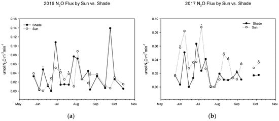 Canopy coverage (shade vs. sun) on nitrous oxide (N2O) emissions for 2016 (a) and 2017 (b). * Means are significantly different at the 0.05 level according to LSD. All cases of significant differences are sun > shade except 8 June 2016 and 31 August 2017.