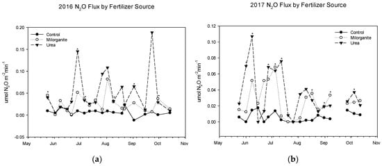 Fertilizer source (control, Milorganite, urea) on nitrous oxide (N2O) emissions for 2016 (a) and 2017 (b). * Means are significantly different at the 0.05 level according to LSD.