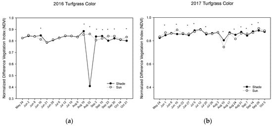 Canopy coverage (shade versus sun) on turfgrass color (NDVI) in 2016 (a) and 2017 (b). Turfgrass color, the normalized difference vegetation index (NDVI) measurements can range from −1 to 1, with higher values indicating greater plant health. * Means are significantly different at the 0.05 level according to LSD.