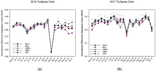 Nitrogen fertilizer treatment on turfgrass color (NDVI) for 2016 (a) and 2017 (b). Turfgrass color, the normalized difference vegetation index (NDVI) measurements can range from −1 to 1, with higher values indicating greater plant health. There were 5 fertilizers treatments: MILH = Milorganite, 294 kg N ha−1 yr−1, MILL = Milorganite, 147 kg N ha−1 yr−1, UREH = urea, 294 kg N ha−1 yr−1, UREL = urea, 147 kg N ha−1 yr−1, UNT = unfertilized control, 0 kg N ha−1 yr−1. * Means are significantly different at the 0.05 level according to LSD.