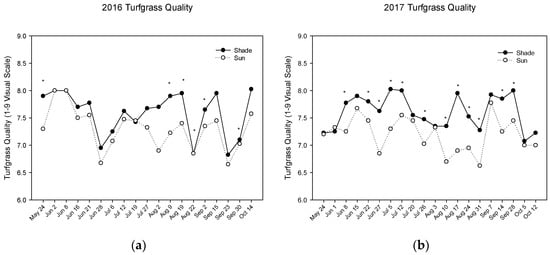 Canopy coverage (shade versus sun) on turfgrass quality on turfgrass quality (1–9 visual scale) in 2016 (a) and 2017 (b). Turfgrass quality is a visual scale (1–9); where 1 = completely brown dead turf, 6 = minimally acceptable turf, and 9 = optimum uniformity, density, and greenness. * Means are significantly different at the 0.05 level according to LSD.