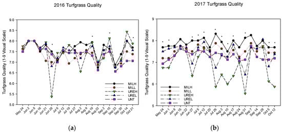 Nitrogen fertilizer treatment on turfgrass quality (1–9 visual scale) for 2016 (a) and 2017 (b). Turfgrass quality is a visual scale (1–9); where 1 = completely brown dead turf, 6 = minimally acceptable turf, and 9 = optimum uniformity, density, and greenness. There were 5 fertilizers treatments: MILH = Milorganite, 294 kg N ha−1 yr−1, MILL= Milorganite, 147 kg N ha−1 yr−1, UREH = urea, 294 kg N ha−1 yr−1, UREL = urea, 147 kg N ha−1 yr−1, UNT = unfertilized control, 0 kg N ha−1 yr−1. * Means are significantly different at the 0.05 level according to LSD.