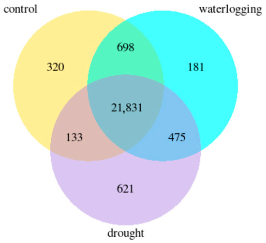 Illumina RNA-Seq generated 73.6 million raw reads and 72.8 million clean reads on average for each leaf sample. The Q30 percentages ranged from 93.5 to 94%, while the GC contents were around 45.4% and 46.2%. The mapping of the clean reads on the reference genome using HISAT2 v2.0.5 software allowed us to map 82% of the clean reads, and 78.5% of them mapped onto a unique position in the genome. In total, 33,044 genes were analyzed, and the gene expression was estimated by Fragments Per Kilobase of transcript sequence per Millions of base pairs sequenced (FPKM). In a first analysis of gene expression (FPKM > 1 as the threshold to determine whether one gene is expressed; padj < 0.05), it was observed that more than 66% of annotated genes were commonly expressed among the three treatments (Figure 1); the number of shared expressed genes between drought and the control was low, while it was four-fold higher between the control and waterlogging. Drought induced the highest number of specifically expressed genes, while in waterlogging a lower number of unique, differentially expressed genes was detected (Figure 1), suggesting a less differential molecular response for this treatment.
