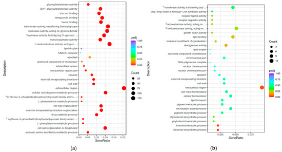 Gene Ontology (GO) enrichment scatter plot of top 30 significantly enriched terms in the GO enrichment analysis. (a). drought vs. control (1 hydrolase activity, hydrolyzing O-glycosyl compounds; 2 oxidoreductase activity, acting on paired donors, with incorporation or reduction of molecular oxygen; 3 erythrose 4-phosphate/phosphoenolpyruvate family amino acid catabolic process; 4 erythrose 4-phosphate/phosphoenolpyruvate family amino acid metabolic process); (b). waterlogging vs. control (1 transferase activity, transferring acyl groups other than amino-acyl groups; 2 oxidoreductase activity, acting on paired donors, with oxidation of a pair of donors resulting in the reduction of molecular oxygen to two molecules of water; 3 oxidoreductase activity, acting on paired donors, with incorporation or reduction of molecular oxygen). Gene ratio = ratio between the number of differentially expressed genes in each GO term and all differentially expressed genes that can be found in the GO database; padj = adjusted p-values ≤ 0.05 are significant; count = the number of differentially expressed genes concerning this term.