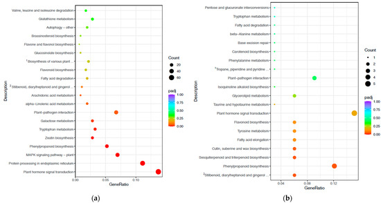 Kyoto Encyclopedia of Genes and Genomes (KEGG) enrichment scatter plot of top 20 significantly upregulated enriched terms in the KEGG enrichment analysis. (a). drought vs. control (1 biosynthesis of various plant secondary metabolites; 2 stilbenoid, diarylheptanoid and gingerol biosynthesis) (b). waterlogging vs. control (1 tropane, piperidine and pyridine alkaloid biosynthesis; 2 stilbenoid, diarylheptanoid and gingerol biosynthesis). Gene ratio = ratio between the number of differentially expressed genes in each pathway and all differentially expressed genes that can be found in the KEGG database; padj = adjusted p-values ≤ 0.05 are significant; count = the number of differentially expressed genes concerning this term.