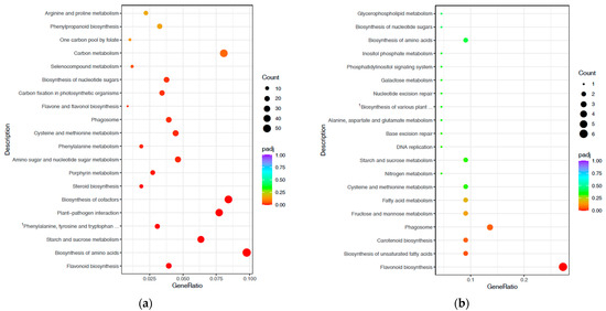 Kyoto Encyclopedia of Genes and Genomes (KEGG) enrichment scatter plot of top 20 significantly downregulated enriched terms in the KEGG enrichment analysis. (a). drought vs. control (1 phenylalanine, tyrosine and tryptophan biosynthesis); (b). waterlogging vs. control (1 biosynthesis of various plant secondary metabolites). Gene ratio = ratio between the number of differentially expressed genes in each pathway and all differentially expressed genes that can be found in the KEGG database; padj = adjusted p-values ≤ 0.05 are significant; count = the number of differentially expressed genes concerning this term.