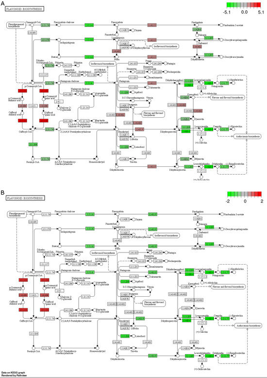 Differentiated genes in control vs. drought stress (A) and control vs. waterlogging (B) in flavonoid metabolism. The green box represents downregulated genes, the red box upregulated genes, and the white box not differentially expressed; padj < 0.05.