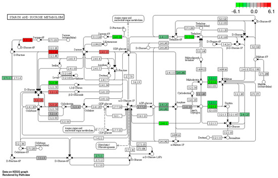 In waterlogging conditions, no differentially expressed genes were found in comparison to the control. In relation to drought stress, we focused on the starch and sucrose metabolism (Figure 7) that showed 51 differentially expressed genes, among which 37 were down- and 14 upregulated. Most of the downregulated genes were related to enzymes that are involved in the metabolism of glucose, like glucose-6-phosphate isomerase (CEY00_Acc04867) and hexokinase (CEY00_Acc32432 and CEY00_Acc10665), or that contribute to starch production, like the 1,4-alpha-glucan branching enzyme (CEY00_Acc16922) and granule-bound starch synthase (CEY00_Acc03251). In addition, amylase (β-CEY00_Acc15000, CEY00_Acc28118, CEY00_Acc28117, CEY00_Acc09124, α - CEY00_Acc31412, CEY00_Acc06307, and CEY00_Acc23514), some transferase as 4-alpha-glucanotransferase (CEY00_Acc13256), sucrose phosphate synthase (CEY00_Acc11414 and CEY00_Acc15447), glucose-1-phosphate adenylyl transferases §(CEY00_Acc03134), as well as trehalose-phosphatase/synthase (CEY00_Acc02730, CEY00_Acc01464, CEY00_Acc, CEY00_Acc21372, CEY00_Acc06522, CEY00_Acc20715, CEY00_Acc25163, CEY00_Acc29021, CEY00_Acc10556, CEY00_Acc19227, and CEY00_Acc06511) were downregulated (Figure 7). On the other hand, those upregulated were mainly linked to the increased transcription of β-glucosidase (CEY00_Acc23018, CEY00_Acc13317, and CEY00_Acc09335) and β-fructofuranosidase (CEY00_Acc27954 and CEY00_Acc22611; Figure 7).