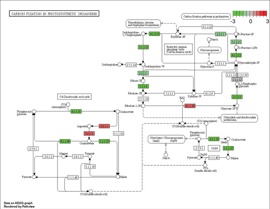 Moreover, in the pathway related to “carbon fixation in photosynthetic organisms”, a downregulation of several genes like phosphoenolpyruvate carboxylase (CEY00_Acc26501, CEY00_Acc19136, and CEY00_Acc28561), malate dehydrogenase (CEY00_Acc27472 and CEY00_Acc19122), fructose-bisphosphate aldolase (CEY00_Acc27551), ribose 5-phosphate isomerase (CEY00_Acc28440, CEY00_Acc09423, and CEY00_Acc17197), and ribulose bisphosphate carboxylase (CEY00_Acc28506) was observed (Figure 8).