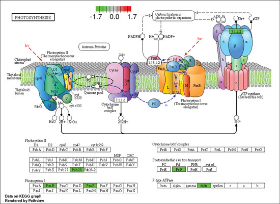 The observed downregulation of genes involved in carbon fixation following drought can be considered a direct effect of the general downregulation of the photosynthetic process. Indeed, several components of the light-dependent reactions of photosynthesis (photosystem I and II, cytochrome b6/f, electron transport chain, and ATP-ase complex) were downregulated in comparison to the control (Figure 9).