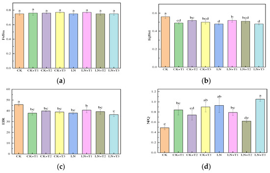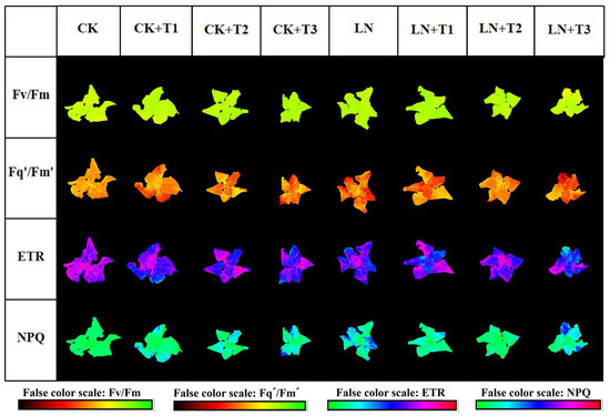 By employing chlorophyll fluorescence imaging and analyzing chlorophyll fluorescence parameters of the lettuce canopy (Figure 1 and Figure 2), we observed that the maximal quantum yield of PSII (Fv/Fm) remained consistently around 0.8 for each distinct treatment (Figure 2a). The CK groups showed the highest values of Fq’/Fm’, followed by LN + TI, with LN and LN + T3 being the lowest (Figure 2b). The CK groups exhibited higher ETR values, followed by LN + T1, with LN + T3 being the lowest (Figure 2c). Compared to the control group, the NPQ values of all other groups increased, especially in LN + T3, LN, and CK + T3 (Figure 2d).
