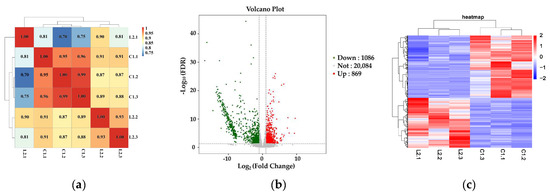The correlation analysis of samples (a), the volcanic map of differentially expressed genes (b), the clustering heat map of differentially expressed genes (c), C: normal nitrogen nutrient solution (CK), L: low nitrogen nutrient solution supplemented with 1 mmol/L sucrose (LN + T1).