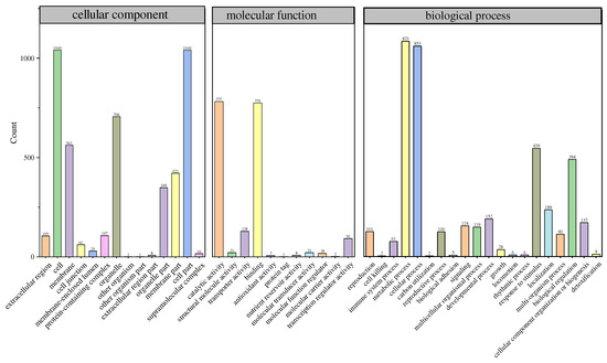 The differentially expressed genes (DEGs) affected a total of 14 cellular component units, 20 biological process units, and 11 molecular function units in the Gene Ontology (GO) analysis (Figure 4). The DEGs related to antioxidant activity were observed in the molecular function category of Gene Ontology (GO), whereas those associated with responses to stimulus were identified in the biological process category of GO.