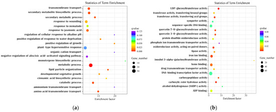 Through the analysis of the GO classification of up-regulated genes in the biological process (Figure 5a), it was discovered that the differentially expressed genes (DEGs) were up-regulated and enriched in secondary metabolic biological processes, secondary metabolic processes, monoterpene biosynthetic process, cinnamic acid biosynthetic process, and response to wounding. The up-regulated genes were linked to cellular components such as UDP-glucose-glycosyltransferase activity, quercetin 7-O-glucosyltransferase activity, and quercetin 3-O-glucosyltransferase activity (Figure 5b).