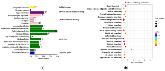 Based on the classification of secondary pathways in KEGG, the up-regulated differentially expressed genes were found to be involved in biosynthesis of other secondary metabolites, metabolism of terpenoids and polyketides, and environmental adaptation (Figure 6a). The enrichment map of differentially expressed genes (DEGs) in the top 20 gene pathways of KEGG revealed that the DEGs were primarily enriched in terms of flavonoid biosynthesis, phenylalanine metabolism, monoterpenoid biosynthesis, terpenoid backbone biosynthesis, MAPK signaling pathway-plant, glutathione metabolism, flavone and flavonol biosynthesis (Figure 6b).