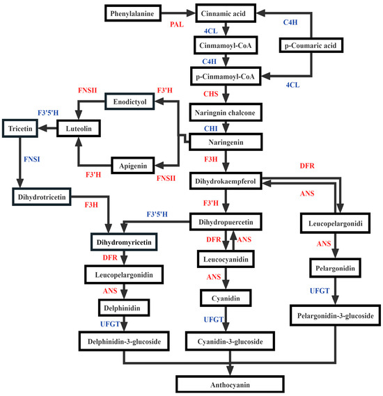 Anthocyanin biosynthesis pathway. The gene name in red font indicates that its expression level increased under nitrogen deficiency nutrient solution supplemented with 1 mmol/L sucrose (LN + T1), and blue indicates no significant change.