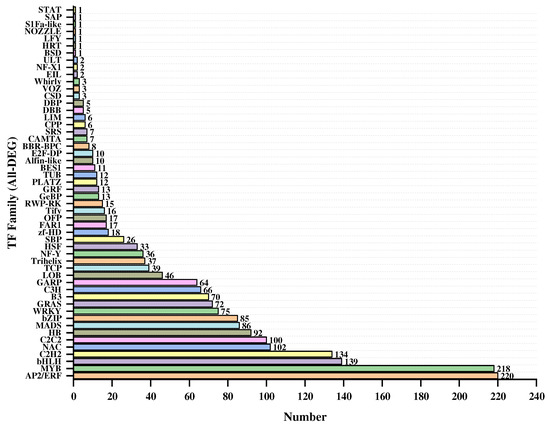 In Figure 8, there are 52 transcription factor families listed in descending order of quantity as follows: AP2/ERF family (220 members), MYB family (218 members), followed by the bHLH family (139 members), C2H2 family (134 members), NAC family (102 members), C2C2 family (100 members), HB family (92 members), MADS family (86 members), bZIP family (85 members), and WRKY family (75 members).