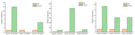 To validate the differentially expressed genes (DEGs) under the treatment of low nitrogen nutrient solution combined with sucrose, nine specific DEGs (LSAT-2x106540 (PAL),LSAT_2x42860 (CHS), LSAT-3x74560 (F3H), LSAT-5x23101 (F3′H), LSAT_2x77261 (DFR), LSAT-9x97280 (ANS), LSAT-1x37841 (JAZ), LSAT-5x72101 (ETR), and LSAT-9x53561 (PP2C)) were chosen for the assessment of their expression levels (Figure 9). In general, the expression results of differential genes were consistent with those of transcriptome sequencing, indicating the reliability and accuracy of transcriptome data.