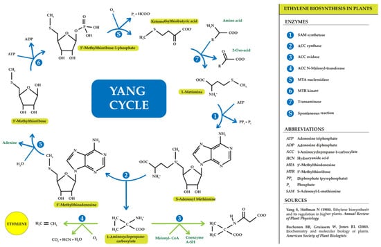 Ethylene originates from the third and fourth carbon of methionine. During the cycle, methionine binds to adenosine to form SAM; subsequently, SAM, apart from giving rise to ACC, can produce 5′-methylthioadenosine (MTA), which, after the cycle repeat reaction and hydrolysis, regenerates methionine, leading to high rates of ethylene production without the need for high levels of intracellular methionine [55]. This ensures that the amino acid content in plants is ready for a new cycle of ethylene production [56,57,58]. This important discovery was made thanks to the work of Professor Shan Fa Yang [4]; therefore, this ethylene production cycle was named the “Yang cycle” (Figure 2).