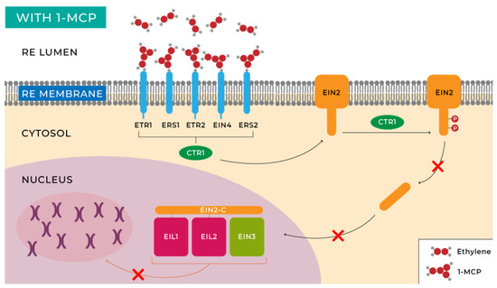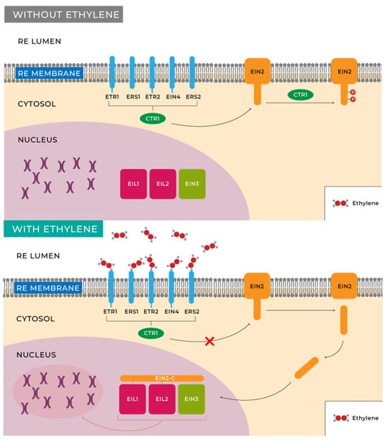 Researchers’ understanding of the ethylene signal transduction pathways primarily stems from genetic and molecular biology studies of Arabidopsis thaliana L mutants [71]. The initial step in ethylene perception involves its binding to receptors for this molecule in plants and fruits. Cells possess a family of five receptors located in the endoplasmic reticulum (ER) membrane that are homologous to bacterial histidine kinases, namely, ETR1, ETR2, EIN4, ERS1, and ERS2, corresponding to ethylene receptors 1, 2, ethylene insensitive 4, and ethylene response sensor 1, 2, respectively, which bind to ethylene with the assistance of a copper cofactor in the transmembrane domain of the protein receptor [71,72,73].