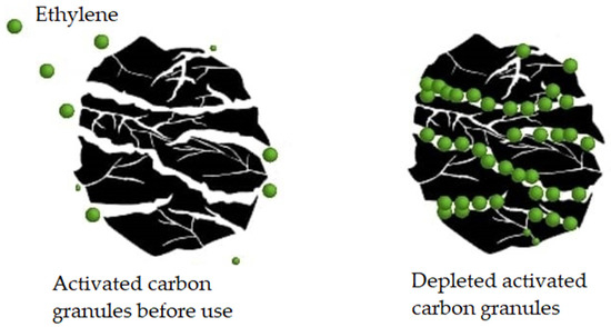 - Bailén, G.; Guillén, F.; Castillo, S.; Zapata, P.J.; Serrano, M.; Valero, D.; Martínez-Romero, D. Use of a Palladium Catalyst to Improve the Capacity of Activated Carbon to Absorb Ethylene, and Its Effect on Tomato Ripening. Span. J. Agric. Res. 2007, 5, 579–586. [Google Scholar] [CrossRef]