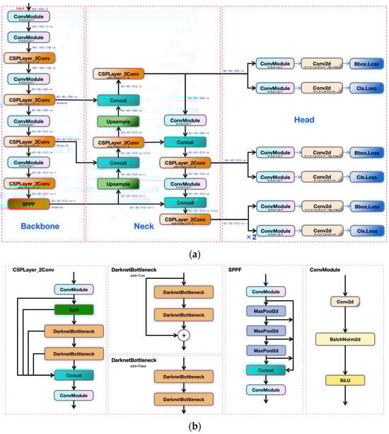 YOLOv8 neural network structure diagram. (a) YOLOv8 network structure diagram. (b) Specific module diagram.