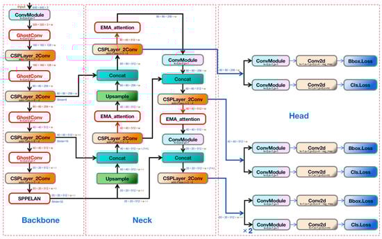 Firstly, we replaced the ordinary convolutional layer in the backbone network with GhostConv to minimize computational parameters while ensuring accuracy [24]. Next, we substituted SPPELAN for SPPF in the ninth layer [25]. We also incorporated the attention mechanism, EMA_attention, in the Neck. Finally, we adapted the original CIoU to WIoU to address the issue of BBR balance between better and worse quality samples [26,27].